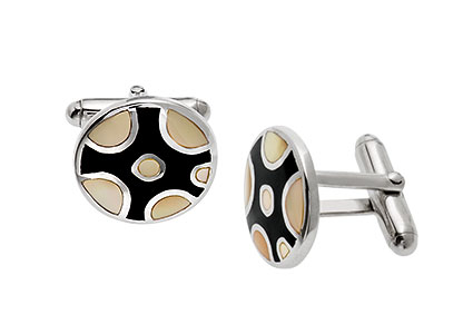 Stand out from the crowd with these stunning unusual abstract shape (roundish) cufflinks, with a beautiful contrast of a shimmering golden yellow mother of pearl and black enamel inlaid in to the silver.