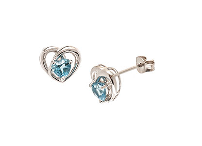 A heart shaped glistening blue topaz is the focal point of these 7.8mm white gold knot earrings.