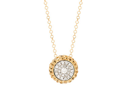 This amazing ball design pendant, is encrusted with white brilliant cut diamonds on a round 18ct white gold disc to the front, set into a yellow sapphire encrusted ball. Supplied with an 18ct yellow gold 16 inch round link trace chain, adjustable to 18inches, which threads through the yellow gold ball.